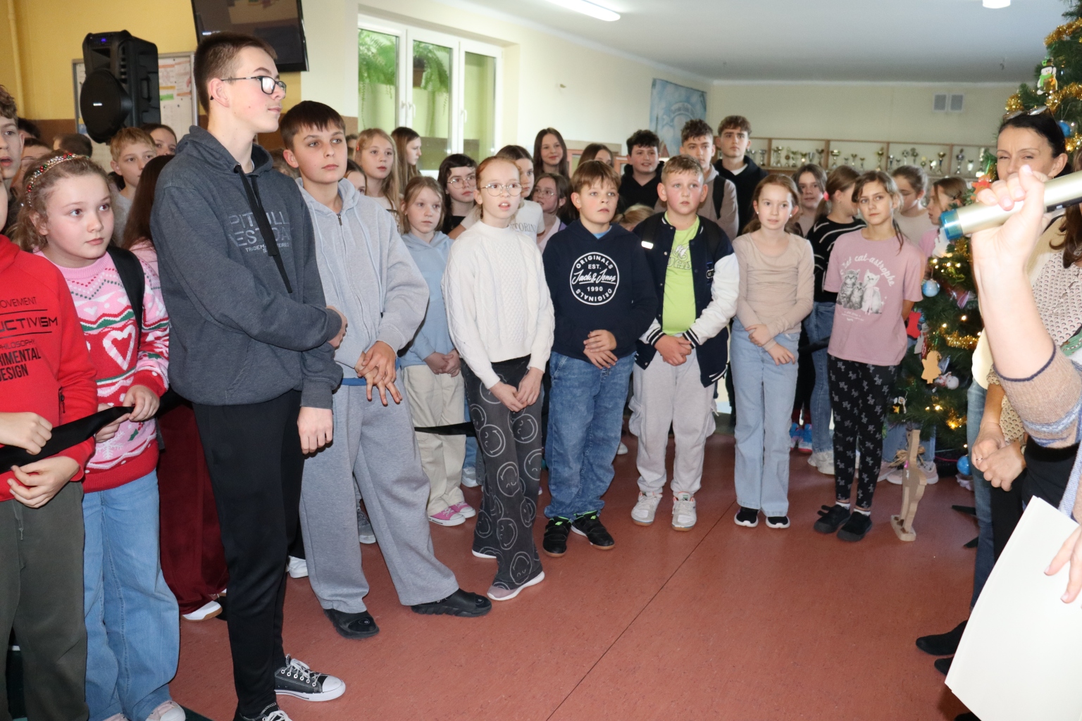4 i 5 grudnia w naszej szkole panowała wyjątkowa atmosfera. Na korytarzach można było spotkać uczniów ubranych w czerwone czapki, reniferowe rogi oraz świąteczne swetry. Na lekcjach rozbrzmiewała świąteczna muzyka, a sale lekcyjne zostały udekorowane kolorowymi girlandami i rysunkami przedstawiającymi Mikołaja. Obchody szkolnych Mikołajek rozpoczął spektakl teatralny klas I-III pt. „W fabryce Św. Mikołaja, czyli elfne zamieszanie”. Wydarzenie wywołało uśmiechy i radość w sercach najmłodszych. Następnie Mikołaj odwiedzał kolejne klasy, wręczając drobne upominki, słodycze i pochwały za dobre zachowanie. Uczniowie przygotowali dla niego krótkie wierszyki lub piosenki.