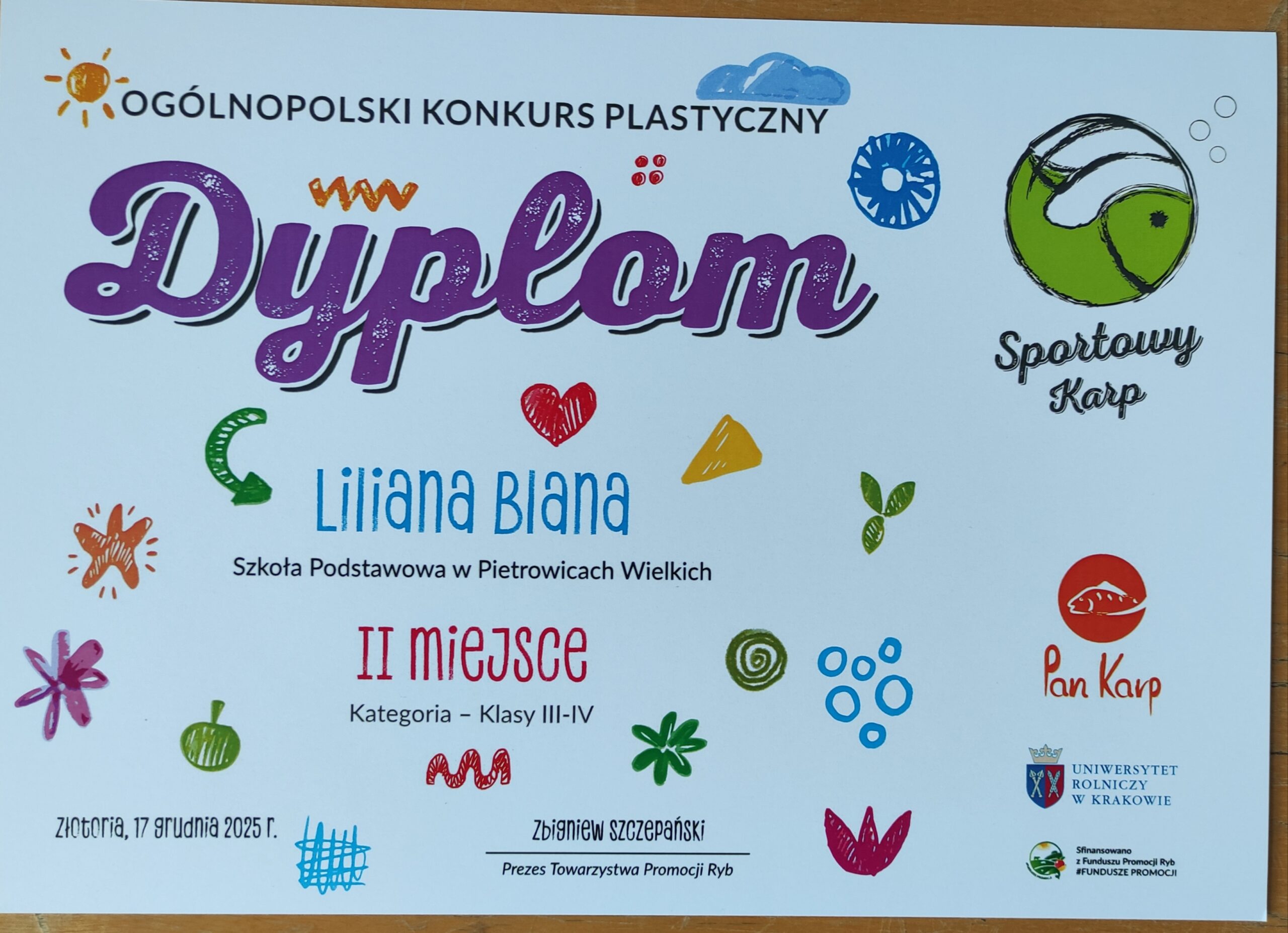Laureatką Ogólnopolskiego Konkursu Plastycznego „Sportowy Karp III” w kategorii klas III-IV została Liliana Blana, która zajęła 2 miejsce. W konkursie brało udział 654 dzieci z 90 szkół ze wszystkich województw. Uczennica klasy 4a swoją pracę wykonała na zajęciach z techniki pod opieką Pani Moniki Pawlita-Posmyk.