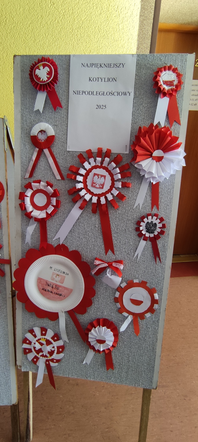 Kotyliony niepodległościowe to ważne symbole patriotyzmu. Ich wygląd, choć często tradycyjny, ma na celu wyrażanie szacunku dla historii i dumy narodowej. Z okazji zbliżającego się Narodowego Święta Niepodległości, w naszej szkole zorganizowany został przez Panią Monikę Pawlita-Posmyk konkurs pt. „Najpiękniejszy Kotylion Niepodległościowy 2025”. Komisja konkursowa, oceniająca prace, miała trudne zadanie ze względu na wysoki poziom artystyczny i różnorodność zastosowanych technik plastycznych. Do konkursu zgłoszono 41 kotylionów z klas 1-8. Uroczyste wręczenie nagród i dyplomów odbyło się 7 listopada 2025 roku. I miejsce w kategorii klas 1-3 przyznano Janowi Machnik z klasy 1b, II miejsce Milenie Hadamiec i Zuzannie Szulc natomiast III miejsce otrzymała praca Hanny Kubiczek. Wszystkie prace uczniów z klas 1-3 były przepiękne i komisja konkursowa postanowiła przyznać wszystkim uczestnikom w tej kategorii drobne upominki.