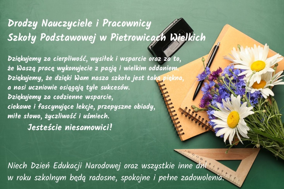 Szczególne słowa wdzięczności kierujemy do Wojewódzkiego Funduszu Ochrony Środowiska i Gospodarki Wodnej za udzielone wsparcie finansowe, które umożliwiło realizację tego projektu. Dziękujemy również organowi prowadzącemu – Gminie Pietrowice Wielkie – za dofinansowanie przedsięwzięcia i wszelką pomoc dzięki której powstała ta wyjątkowa przestrzeń edukacyjna.