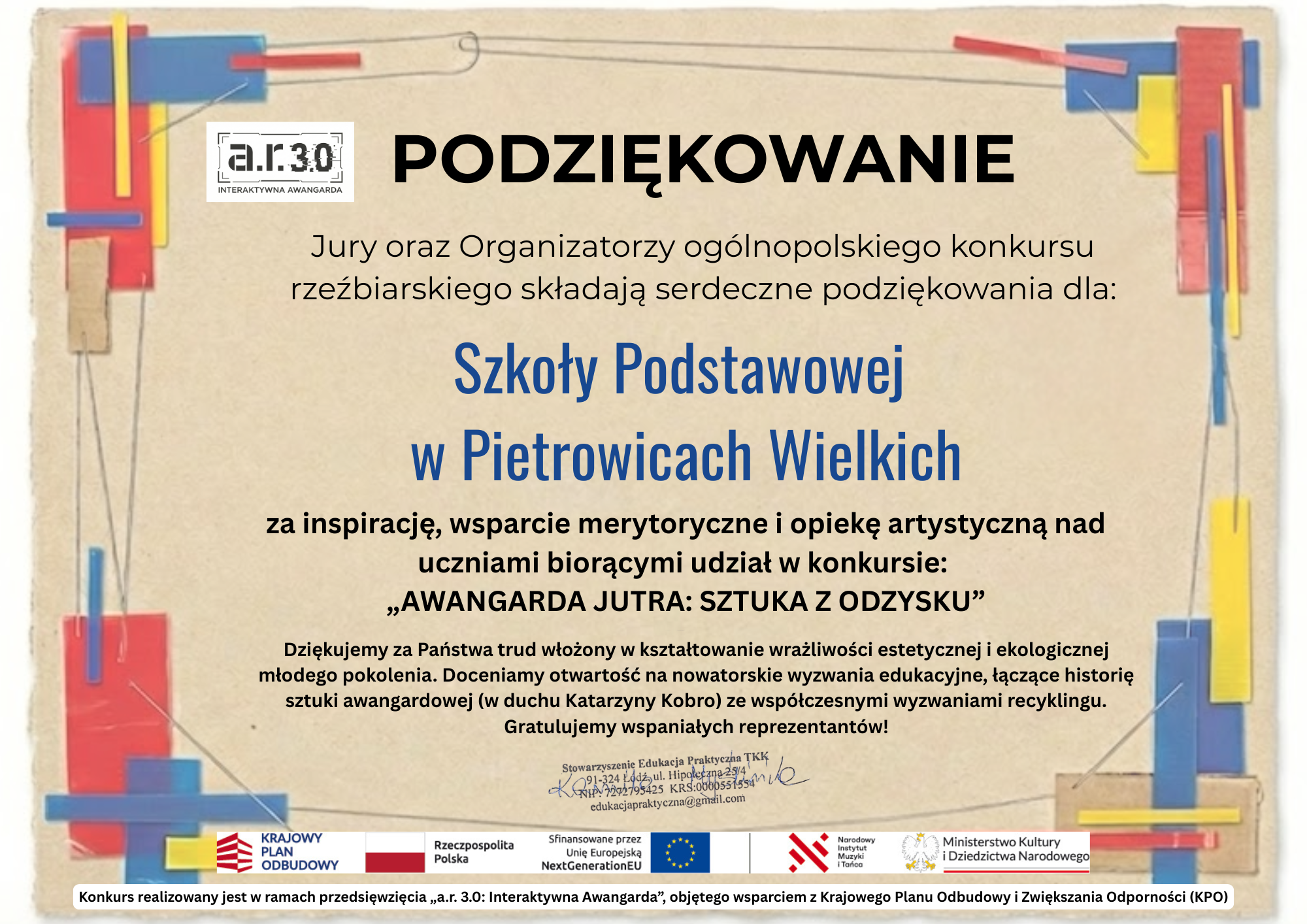 W ogólnopolskim konkursie „Awangarda jutra: Sztuka z odzysku” naszą szkołę reprezentowało 5 uczniów (Emilia Przybyła, Wiktor Flegel, Tomasz Wieczorek, Julia Lakomek, Laura Macyszyn). Każda z prac była unikalną, przestrzenną formą rzeźbiarską, wykonaną w 100% techniką upcyclingu. To dowód na ogromną kreatywność i świadomość ekologiczną. Nasi uczniowie znaleźli się w gronie młodych projektantów „awangardy jutra” (rywalizowali z autorami aż 118 prac nadesłanych z 67 szkół z całej Polski).